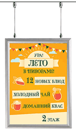 Отличный способ презентовать ваши плакаты в местах, где нет возможности для настенного монтажа. Это подвесить с помощью тросиков или лески постеры что было возможно рассматривать с обоих сторон. Очень оригинально, компактно и наглядно выглядит реклама в подвесных