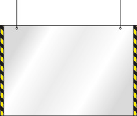 Подвесные защитные экраны с боковой разметкой. Подвешиваются на тросиках к потолку или конструктивным элементам. Боковая разметка делает защитный экран заметным для клиентов. Такие экраны используются для оборудования рабочего места в центре зала при существующей опасности для клиентов травмироваться, не заметив прозрачный защитный экран.